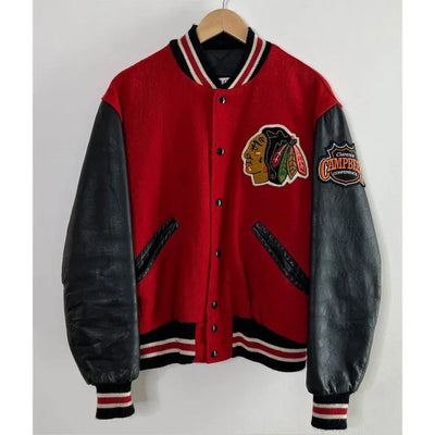 Chicago Blackhawks Campbell Red Wool & Black Genuine Leather Sleeves Men's Letterman Varsity Jacket