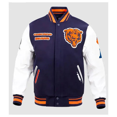 Chicago Bears Navy Blue Wool & White Genuine Leather Sleeves Full-Snap Men's Varsity Jacket