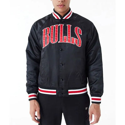 Chicago Bulls Applique Full-Snap Varsity Black Satin Men's Bomber Jacket