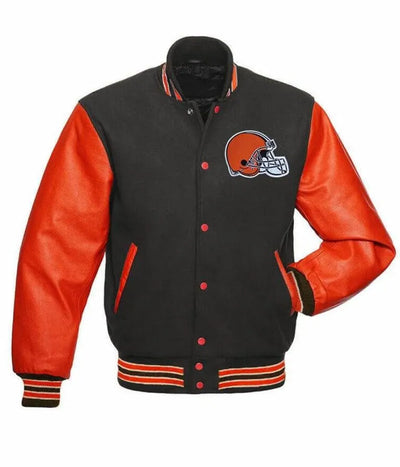 Cleveland Browns Black Wool & Orange Genuine Leather Sleeves Full-Snap Men's Varsity Jacket