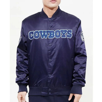 Dallas Cowboys Wordmark Full-Snap Varsity Navy blue Satin Men's Bomber Jacket