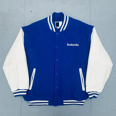 1990’s Seattle Seahawks Royal Blue Wool & White Genuine Leather Sleeves Men's Varsity Letterman Jacket