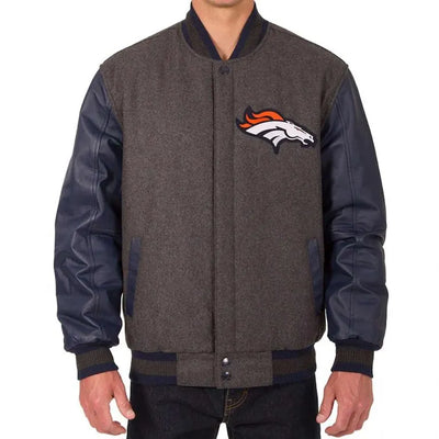 Denver Broncos Charcoal Wool & Navy Blue Genuine Leather Sleeves Men's Varsity Jacket