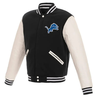 Detroit Lions Black Wool & White Genuine Leather Sleeves Men's Varsity Jacket