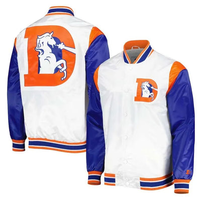 Denver Broncos Throwback Warm Up Pitch Full-Snap Varsity Royal Blue & White Satin Men's Bomber Jacket