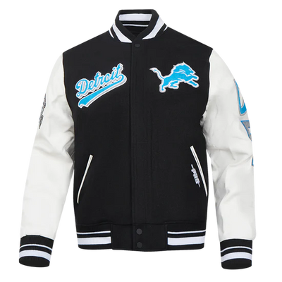 Detroit Lions Mashup Rib Black Wool & White Genuine Leather Sleeves Men's Varsity Jacket