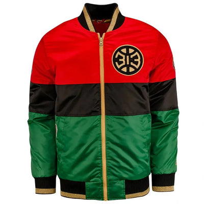 Detroit Pistons Color Block History Month Full-Zip Varsity Tri Color Satin Men's Bomber Jacket