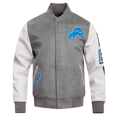 Detroit Lions Grey Wool & White Genuine Leather Sleeves Men's Varsity Jacket