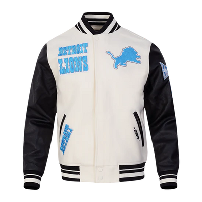 Detroit Lions Off White Wool & Black Genuine Leather Sleeves Men's Varsity Jacket