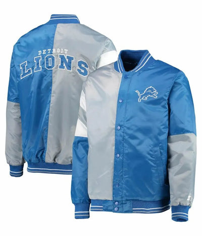 Detroit Lions Leader Full-Snap Varsity Blue and Grey Satin Men's Bomber Jacket