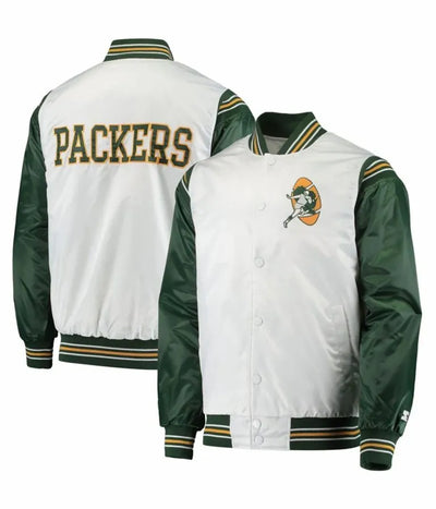 Green Bay Packers Scout Full-Snap Varsity White Satin Men's Bomber Jacket