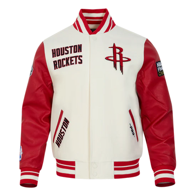 Houston Rockets Retro Classic Rib Varsity Off-White Wool & Red Genuine Leather Sleeves Men's Bomber Jacket