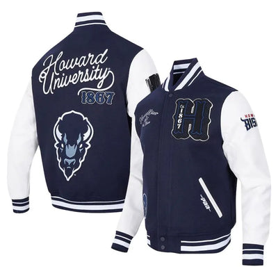 Howard Bison HBCU Navy Blue Wool & White Genuine Leather Sleeves Men's Letterman Varsity Jacket