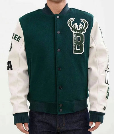Milwaukee Bucks NBA Varsity Green Wool & Beige Genuine Leather Sleeves Men's Jacket