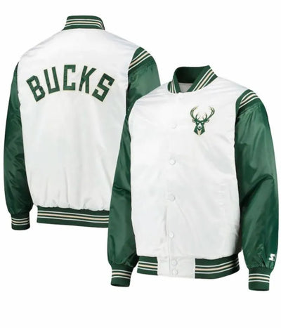 Milwaukee Bucks Full-Snap Varsity White and Green Satin Men's Bomber Jacket