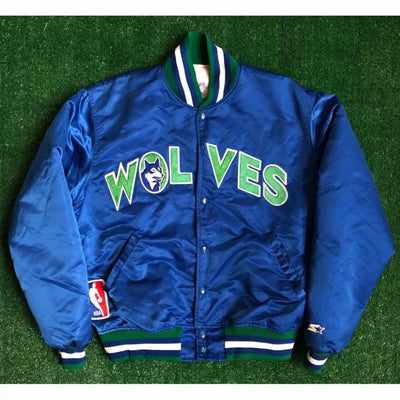 90โs Minnesota Timberwolves Full-Snap Varsity Blue Satin Men's Bomber Jacket