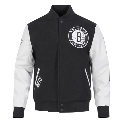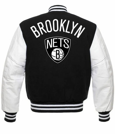 Brooklyn Nets NBA Black Wool & White Genuine Leather Sleeves Men's Varsity Letterman Jacket