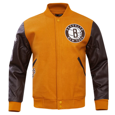 Brooklyn Nets NBA Orange Wool & Brown Genuine Leather Sleeves Men's Varsity Letterman Jacket