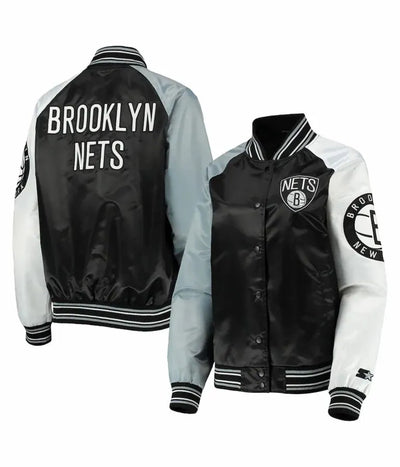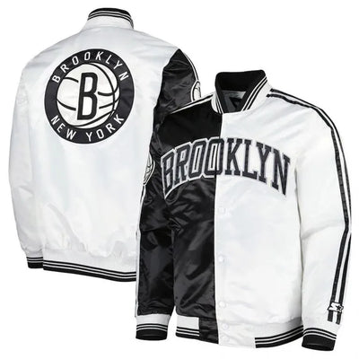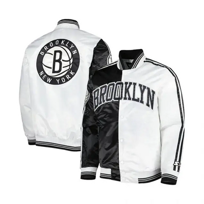 Brooklyn Nets Full-Snap Varsity White and Black Satin Men's Bomber Jacket