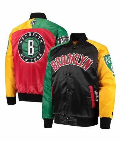 Brooklyn Nets 75th Anniversary Black History Month Full-Snap Varsity Color-Block Satin Men's Bomber Jacket