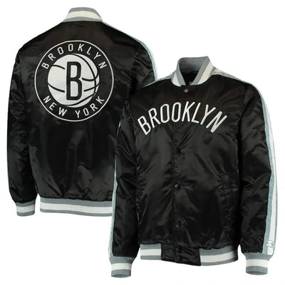 Brooklyn Nets Leader Full-Snap Varsity Gray & Black Satin Men's Bomber Jacket