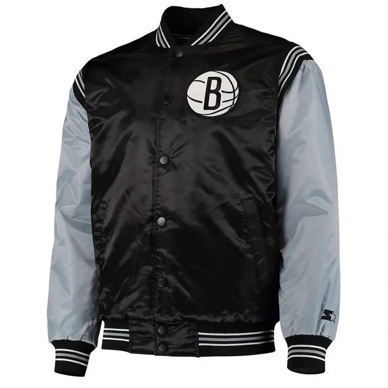 Brooklyn Nets The Enforcer Full-Snap Varsity Black/Gray Satin Men's Bomber Jacket