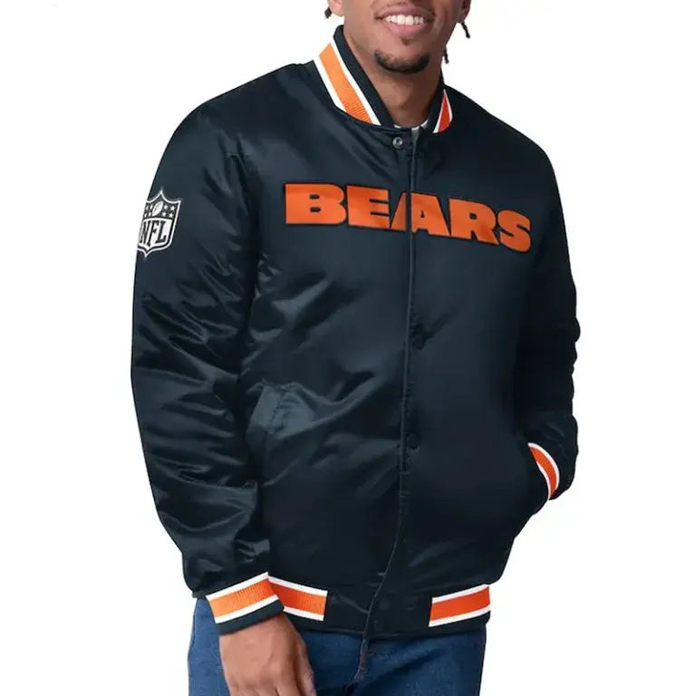 Chicago Bears Closer Full-Snap Varsity Navy Blue Satin Men's Bomber Jacket