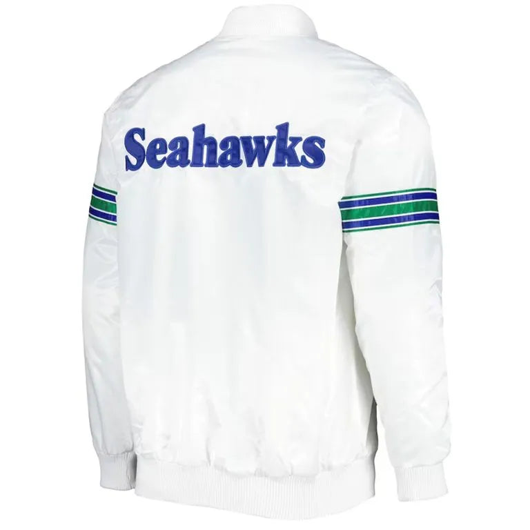 Seattle Seahawks The Power Forward Full-Snap Varsity White Satin Men's Bomber Jacket